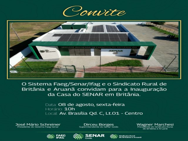 🔗 Inscrição gratuita: sistemafaeg.com.br/eventos/inauguracao-uac-senar-britania